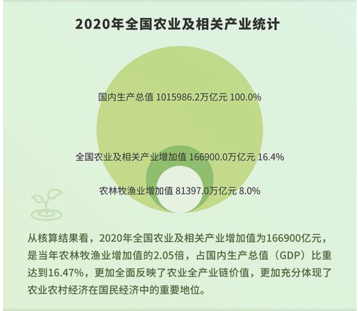 據(jù)國家統(tǒng)計(jì)局1月12日消息,2020年,全國農(nóng)業(yè)及相關(guān)產(chǎn)業(yè)增加值166900億元,占GDP比重為16.47%。農(nóng)業(yè)及相關(guān)產(chǎn)業(yè)增加值是農(nóng)林牧漁業(yè)增加值的2.05倍。