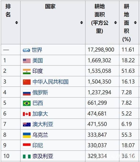 在全球耕地面積排名中,美國的耕地面積遙遙領(lǐng)先,印度第二,中國第三。